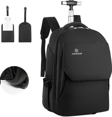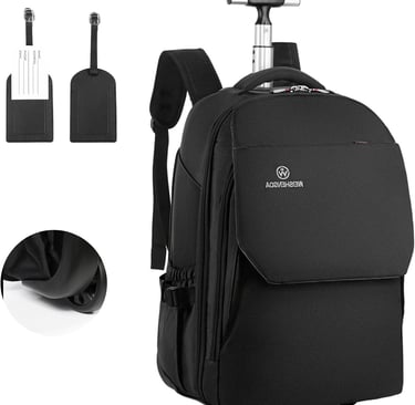 This 19-inch rolling backpack combines style and practicality, making it ideal for students, travelers, and professionals. Crafted with water-resistant materials, it ensures durability and protection for your belongings. The bag features quiet, smooth-rolling wheels for easy maneuverability, along with packable straps for added versatility when carrying it as a traditional backpack. With a dedicated laptop compartment and ample storage space, it serves as a perfect carry-on for business trips or personal travel. The sleek black design adds a touch of elegance, making it a reliable and fashionable choice for various occasions.